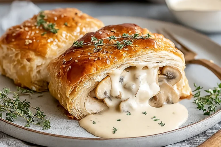 Chicken Wellington with Dijon Cream Sauce is a flaky, golden puff pastry wrapped around juicy chicken, sautéed mushrooms, and spinach, finished with a rich and creamy Dijon sauce. This elegant yet approachable dinner is perfect for special occasions or when you want to turn an ordinary weeknight into something unforgettable.