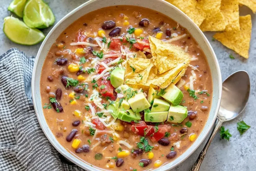 Cozy up with this Crockpot Vegetarian Tortilla Soup! Packed with lentils, beans & spices, it’s hearty, flavorful, and perfect for busy nights.